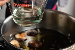 - Add 4 cups vegetable stock/broth, 4 cups water, ½ oz kombu (dried kelp), and 1 oz dried shiitake mushrooms. Slowly bring it to a simmer. When it almost reaches a simmer, remove the kombu from the liquid and discard it. Continue to simmer uncovered for 5 minutes. Remove from the heat and set it aside. Keep the pot of soup uncovered while prepping the other ingredients. The moisture will continue to evaporate, allowing the soup to develop more concentrated flavors.