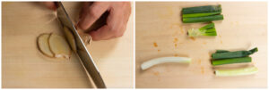- Thinly slice 1 knob ginger into about 3 slices. Cut and separate 1 Tokyo Negi (Naga Negi; long green onion) into four sections: 1) the white stalk; 2) the Y-shaped piece where the white stalk and light green leaves meet; 3) the light green leaves; and 4) the dark green tops. Reserve the outer layers of the white stalk for the Shiraga Negi (white scallion topping) and the stalk‘s light green core for the aroma oil (See Step 2 of “To Prepare the Toppings“ for how to remove the core). For making the soup, we‘ll use half of the dark green tops plus the Y-shaped piece (see center top of the photo, below right).