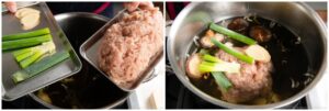 - To the pot of 12 cups Cold Brew Dashi add 1½ lbs ground chicken, the ginger slices, half of the Negi‘s dark green tops, and the Y-shaped Negi piece.