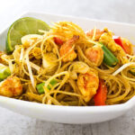 - Add remaining 1 tablespoon oil, curry powder, garlic, and ginger to now-empty skillet and cook over medium heat until fragrant, 15 to 30 seconds. Add soy sauce mixture and noodles, tossing to coat noodles with sauce, and cook until liquid is absorbed but noodles are still glossy, 1 to 2 minutes. Season with salt and pepper to taste. Divide among individual serving bowls, then top with vegetable mixture and shrimp and sprinkle with cilantro and scallions. Serve with lime wedges.