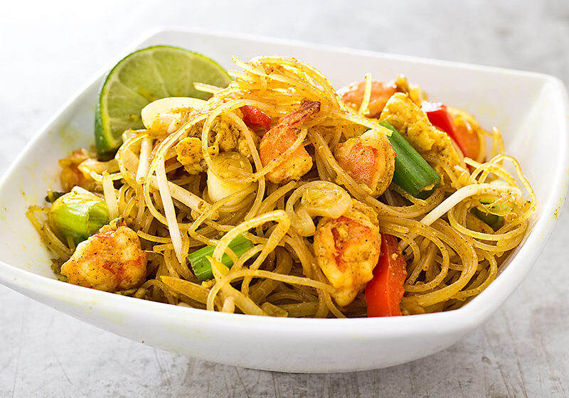 Packed with curry flavor, stir-fried vegetables, and shrimp, Singapore-style noodles make for a perfect weeknight dinner. We swapped out the traditional, but delicate, rice vermicelli for resilient Chinese egg noodles, which held together during cooking. To develop complex flavor, we bloomed curry powder and aromatics in oil before adding soy sauce, sugar, and lime juice and tossing with the noodles. Sautéed carrots and red bell peppers, along with shrimp and cilantro, completed this speedy, satisfying dish. You can use any thin fresh Chinese egg noodle in this recipe; boil until just tender but still chewy. After preparing the Sautéed Shrimp, you can reuse the skillet for this recipe.