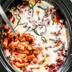 - Cook: Cover with lid and cook on HIGH for 2 – 2 ½ hours, or LOW for 3 ⅓ -4 hours, or until pasta is tender. Serve garnished with fresh basil, if desired.
