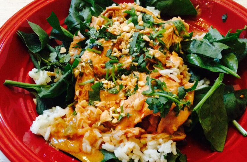 The strength of the hot salsa dissipates when cooked, so this dish is not too spicy. You may even want to serve hot-sauce as an accompaniment. Regular coconut milk can replace the low-fat, if desired. If you don’t have chunky peanut butter, use regular peanut butter.
