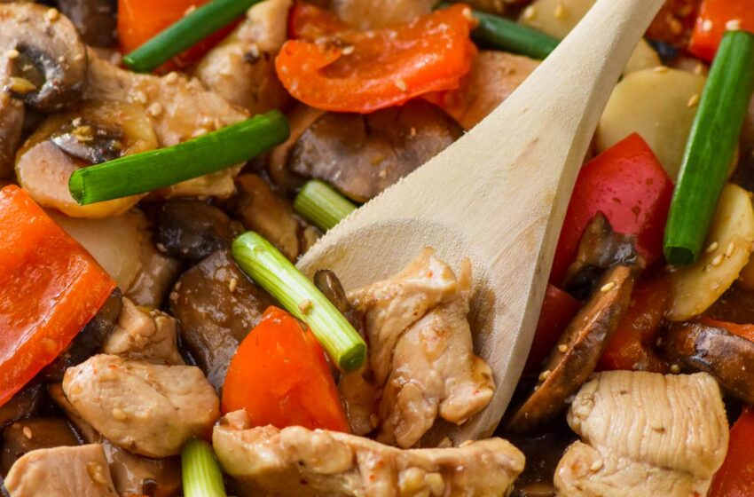 Szechuan-style Chicken Stir-Fry complements chicken with bell peppers, pea pods, scallions and a lively ginger-soy sauce. Serve the recipe solo, over rice, or with Oriental rice noodles, as preferred.in place of exotic chile oils or mouth-searing dried peppers, this recipe relies on the garden-fresh flavor and lively Jalapeño "heat" of picante sauce in the cook's choice of mild, medium or hot.