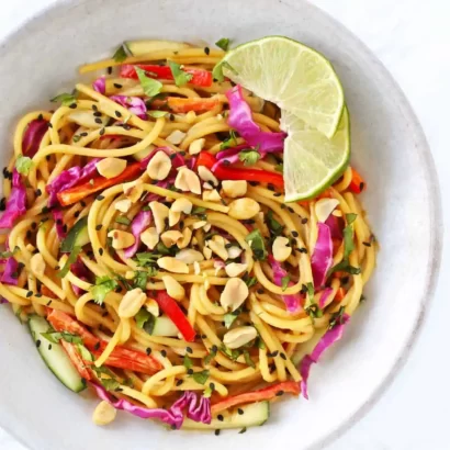A simple delicious recipe for Thai Noodle Salad with Peanut Sauce, loaded up with healthy veggies. Vegan and Gluten free, this make-ahead salad is perfect for midweek lunches or large gatherings.