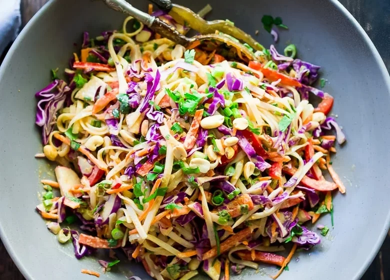 • Toss: Place shredded veggies, bell pepper, scallions, cilantro and jalapeño into a serving bowl. Toss. Add the cold noodles to the serving bowl and toss again. Pour some peanut sauce over top and toss well to combine- no need to use all, just use enough to coat well. ( Save the extra sauce for any leftover salad-as it can soak up the sauce overnight.)