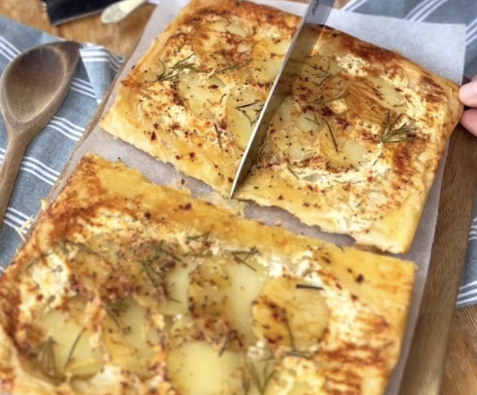 - Roll out your pastry sheet and cut it into squares large enough to cover the potatoes. Slather each square of pastry with the garlic and herb cream cheese leaving a little trim around the edge. Lay them down, onto the potatoes.
